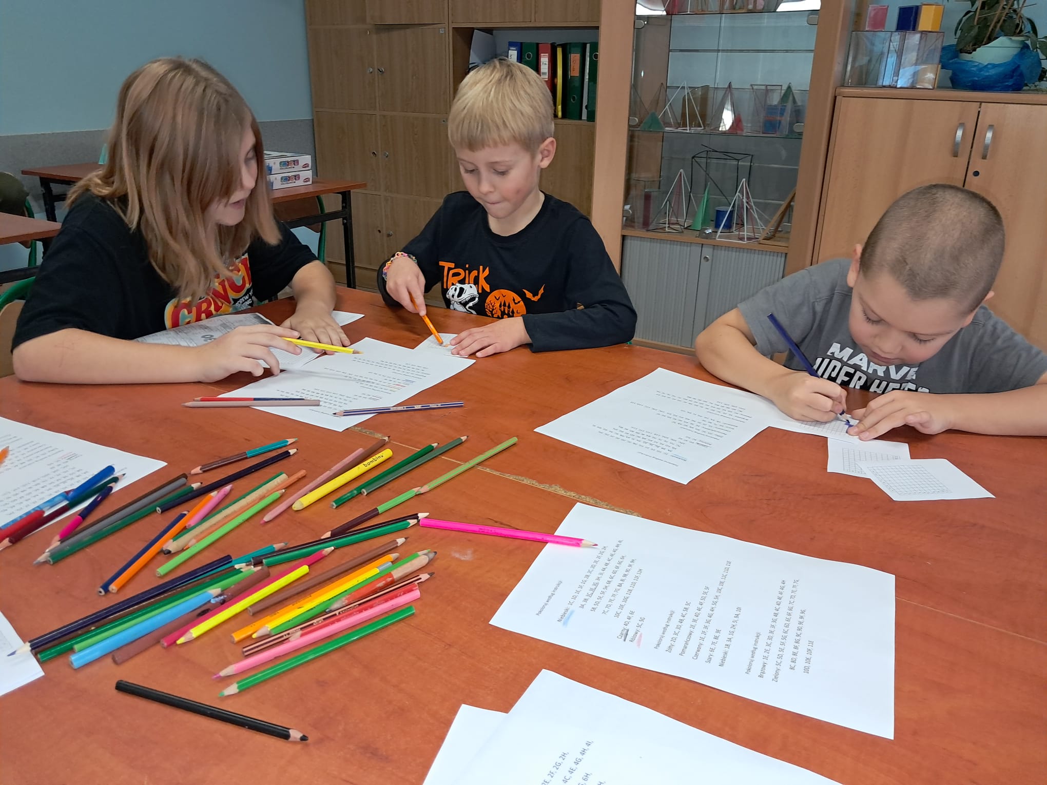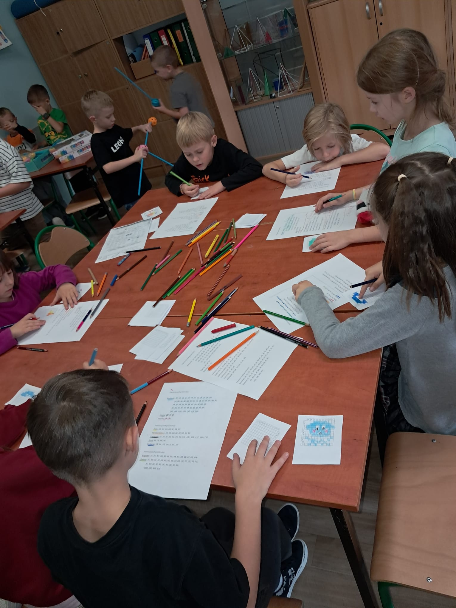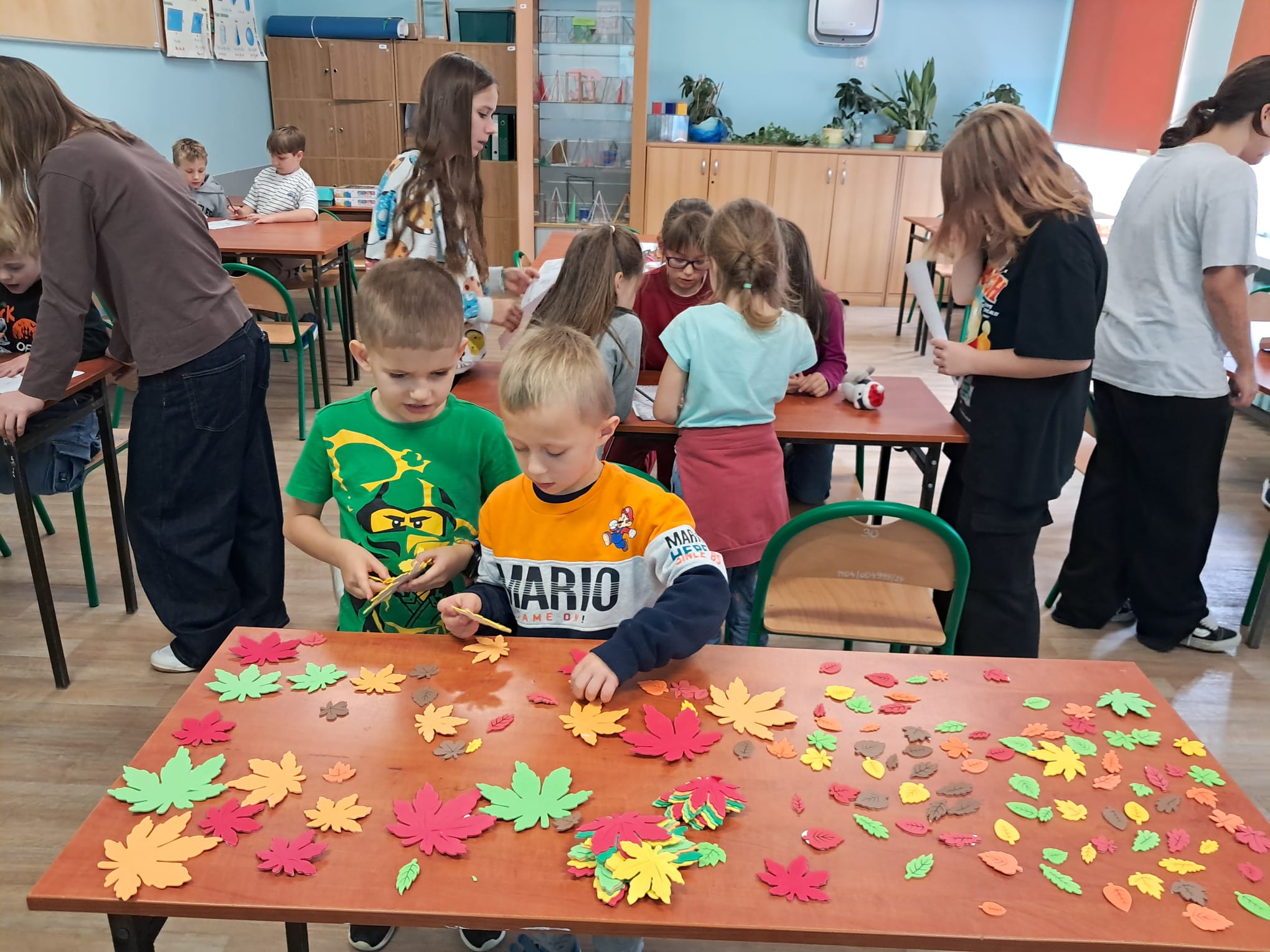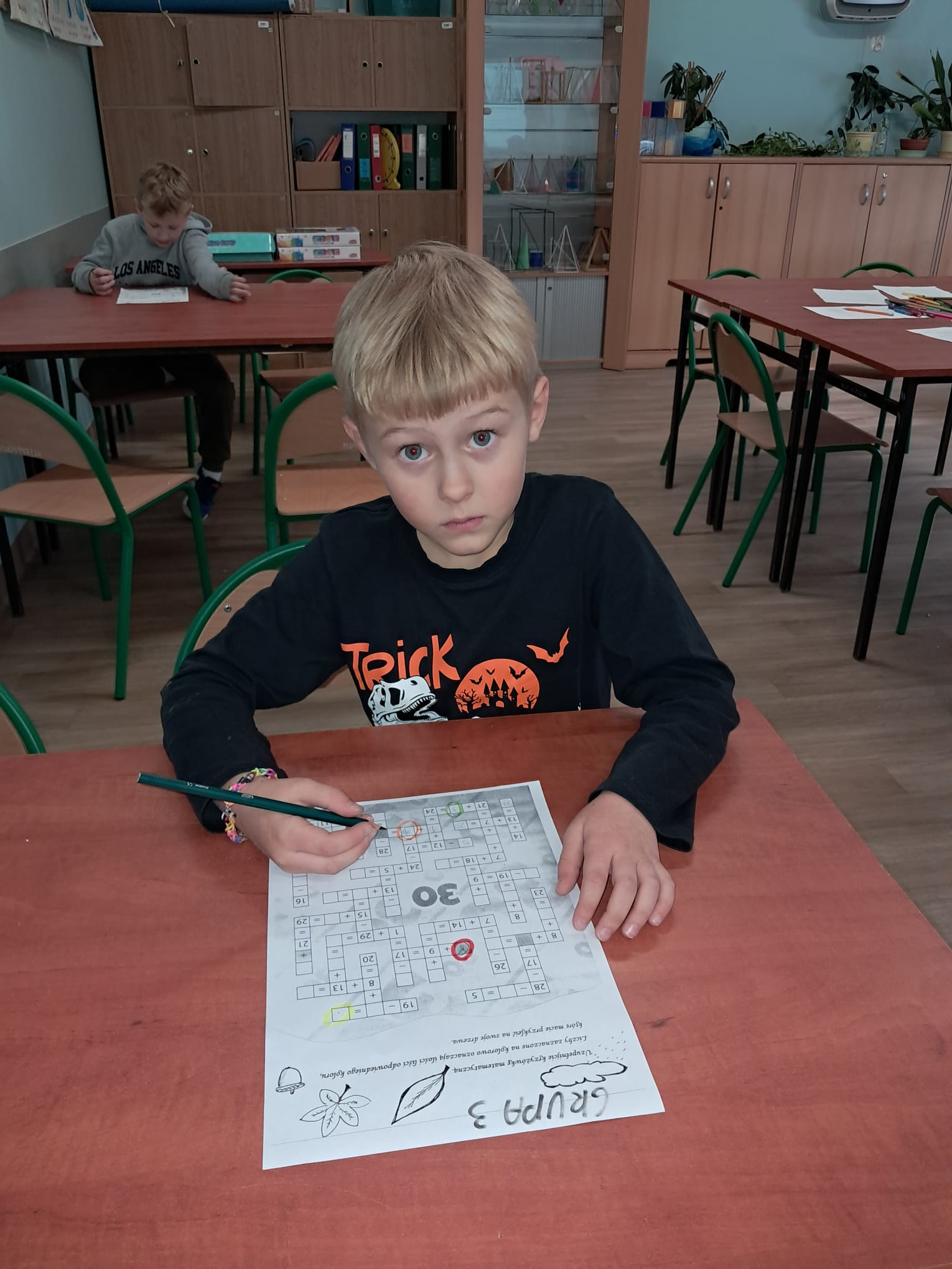 Z jesienią w tle uczniowie klas 1-3 rozwiązywali krzyżówki matematyczne, przyklejali listki według instrukcji oraz  kodowali.